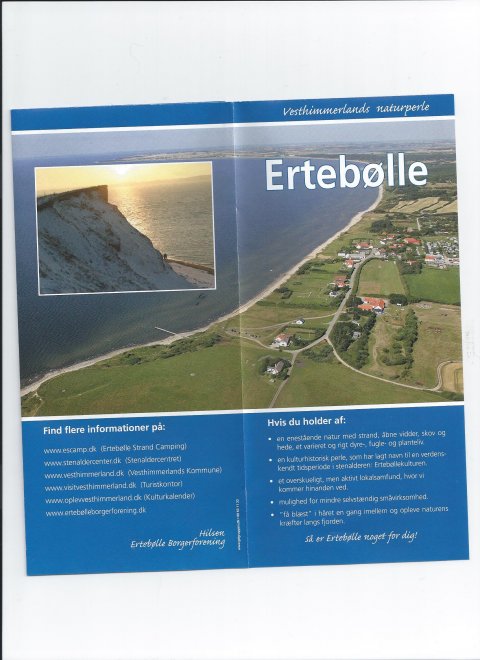 Folderen beskriver alle Ertebølles herligheder, lige fra den rige kulturarv, vi har i form af køkkenmøddingen fra Stenalderen, som beskrives flot på Stenaldermuseet, den flotte natur med fjord og klinter til det fællesskab og sammenhold, der i dag karakteriserer vores lille samfund.